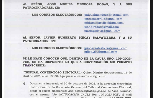 Como parte de las medidas adoptadas, el juez Viteri dispuso notificar al Consejo Nacional Electoral y al Ministerio del Trabajo para que certifiquen la vigencia de la suspensión dentro de sus respectivas competencias.