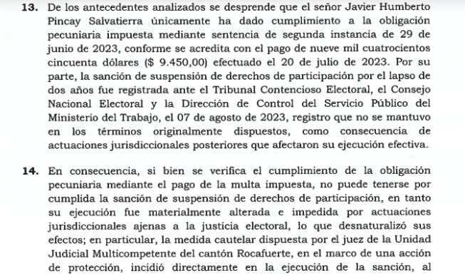 Dicha medida cautelar ordenó dejar sin efecto la aplicación de la sanción, lo que permitió que Pincay continuara en funciones. Sin embargo, el TCE ha sido enfático al señalar que este tipo de acciones constitucionales no constituyen un mecanismo válido para modificar o suspender decisiones adoptadas en materia electoral.